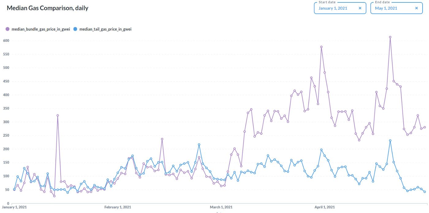 Although Flashbots bundles typically have 0 gas price transactions, bundles do have an “effective” gas price that can be found by taking the bundle’s coinbase transfer payments divided by the gas that the bundle consumes. MEV-Geth compares the bundle’s gas price to the gas price of transactions at the tail end of the block, which we refer to as the “tail gas price.” As you can see in the above graph the bundle gas price closely tracked tail gas price until roughly the start of March, when there was an uptick in searcher adoption on Flashbots. At that point the median bundle gas price was substantially higher than the tail gas price and the difference between the two continued to grow until it stabilized in April.